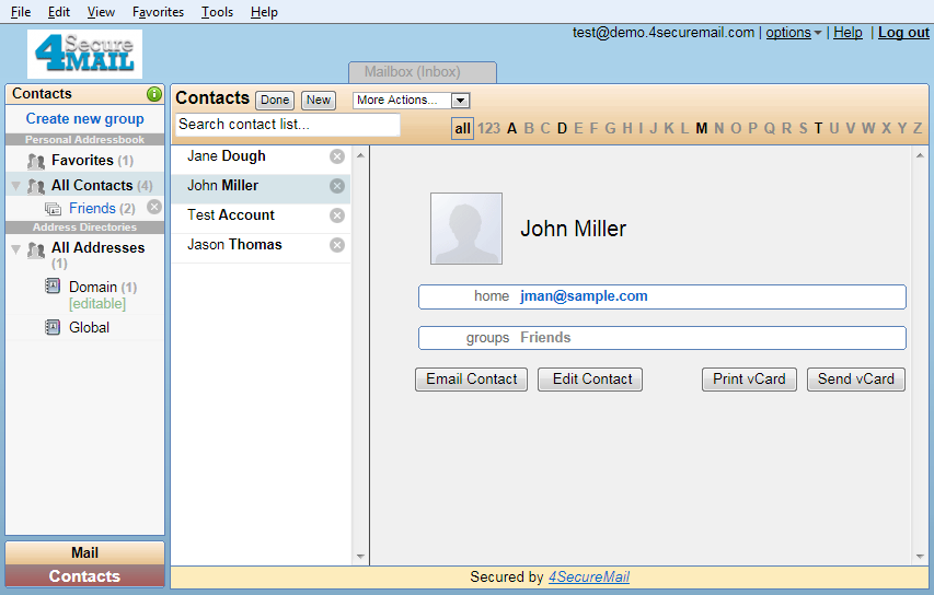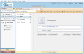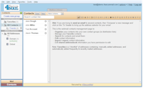The contacts management page enables more detailed contacts management functions including organizing contacts into groups (aka distribution lists), manually add or remove contact information, and edit contacts providing additional information.