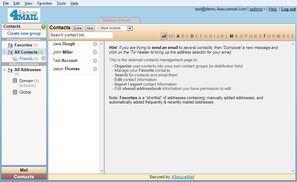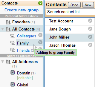 Contacts can be imported into groups by directly typing in a list of addresses or through the use of standard vCard and CSV files generated from Outlook and other applications. Updating addresses from the old webmail interface is available as well. If you select a group to add your contacts, all get added to this group in addition to groups setup based on the source file. If an address already exists during an import, it is updated and not duplicated. Import is available through the contact application "More action" pull-down menu.